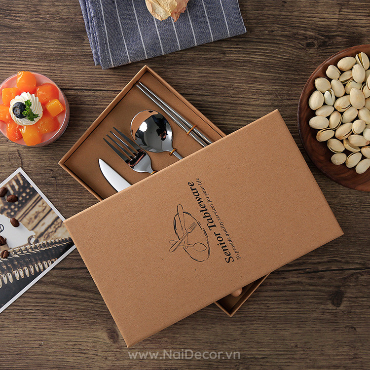 Sản phẩm gồm có: Dao, nĩa, muỗng, đũa, kèm hộp đựng