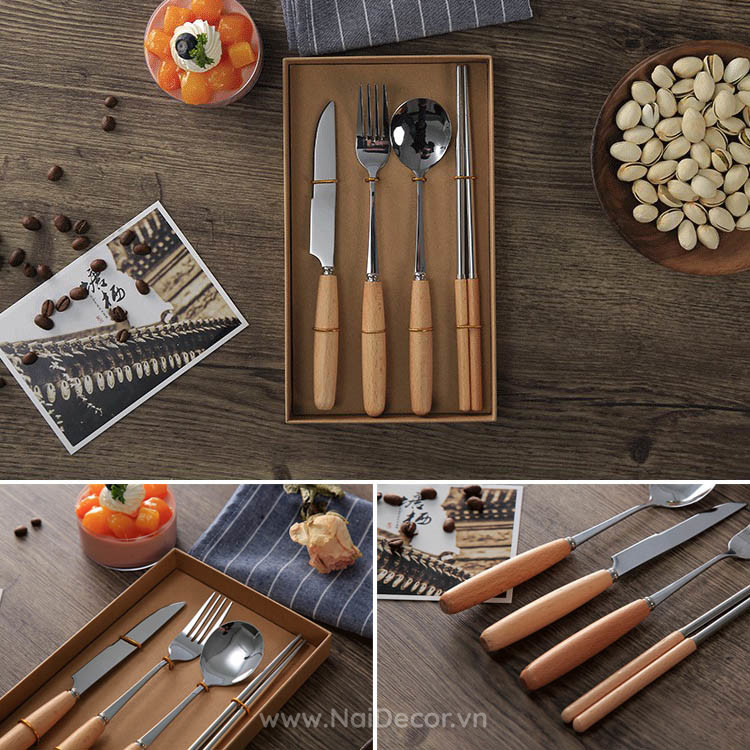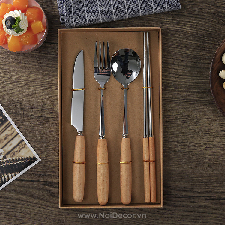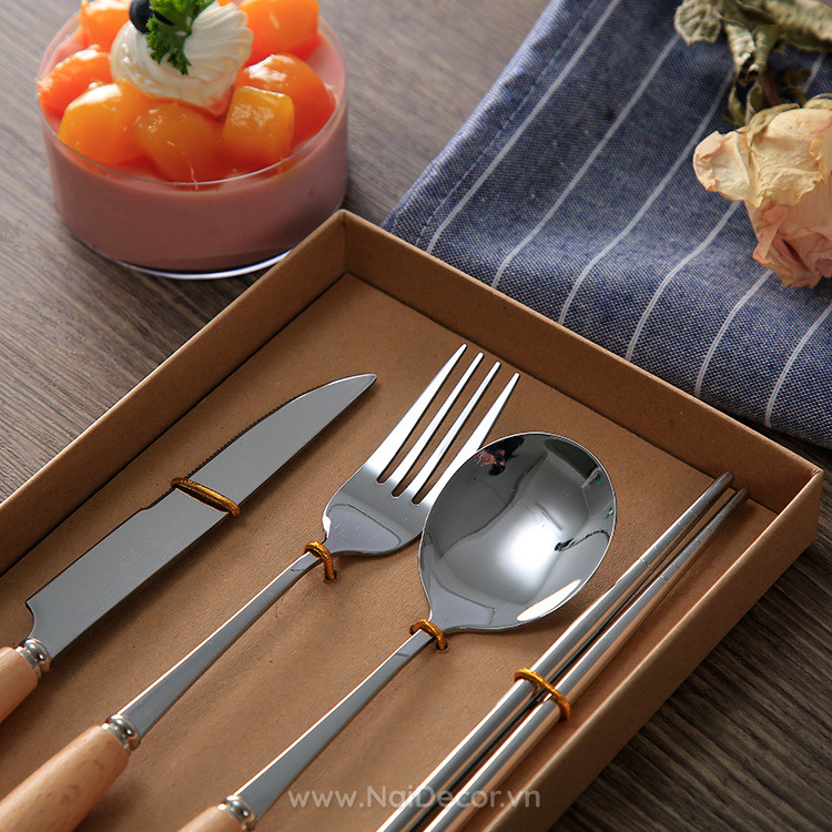 Bộ muỗng đũa nĩa dao – Chuôi gỗ (Kèm hộp)
