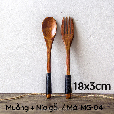04. Muỗng + Nĩa gỗ 18cm – Màu nâu (Dây đen)